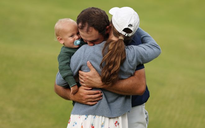 シェフラーが表彰式に出席中、グリーン周りで見ていたベネットちゃん(左)は、大きな丘を転びながらも登り、父の元にかけ寄った。「全米プロ」の表彰式で、初めてひとり立ちできた彼も、今では歩けるまでに成長している。そんな成長ぶりを、シェフラーのメジャー優勝のたびに見ることができるのもおもしろい。©GettyImages