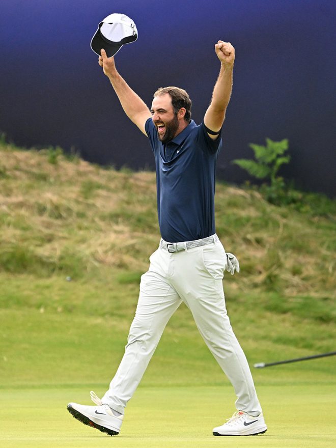 「全英オープン」初優勝を遂げ、拳を突き上げて喜ぶシェフラー。©R&A