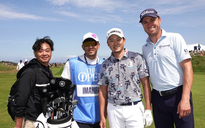 ジャスティン・トーマス(右)と練習ラウンドをした今平(右から2番目)。©Eiko Oizumi