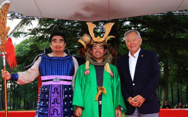 1995年4月23日生まれ。158cm、70kg。沖縄県出身。ツアー通算7勝。2022年は4勝を挙げ、賞金王。今季はアジアンツアーにも出場し、ポイントランキング8位。左はISPS 半田晴久会長、右はJGTO諸星裕会長。©Yoshitaka Watanabe