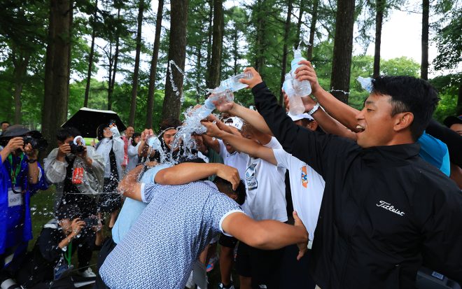優勝が決まると、グリーンサイドで待っていた池村寛世らプロ仲間たちがウォーターファイトで祝福。©Yoshitaka Watanabe