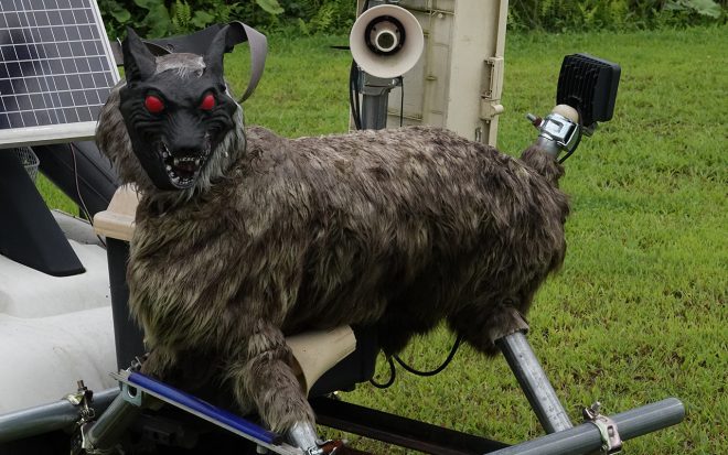 害獣対策の「モンスターウルフ」が、夜中にコースで3台稼働。その風貌と鳴き声が話題となった。©Tsukasa Kobayashi