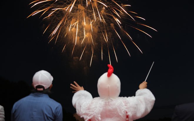 プロレスの後は、半田会長の歌に合わせて、花火1000発が打ち上げられた。写真は歌に合わせて指揮をする半田会長(右)と花火を鑑賞する小平。©ISPS