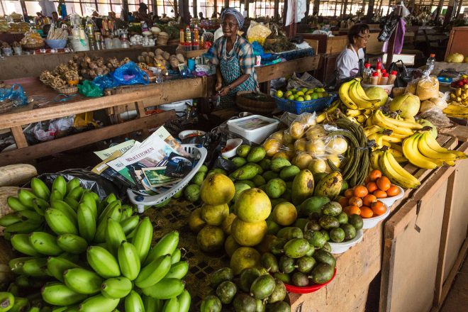 首都パラマリボの青空市場で売られている、トロピカルフルーツの数々。人口の25%が農業に従事しており、米、バナナなどは主要な輸出品。