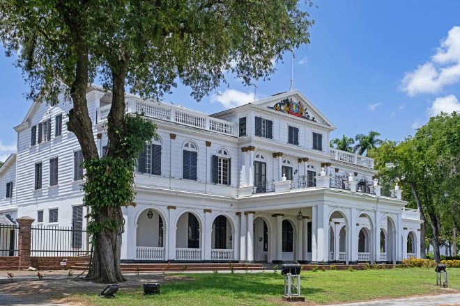 パラマリボにある、オランダ植民地様式の大統領官邸。今年の7月半ばまでチャン・サントキ氏が大統領だったが、現在は女性のジェニファー・ギアリングス・シモンス氏が大統領に。