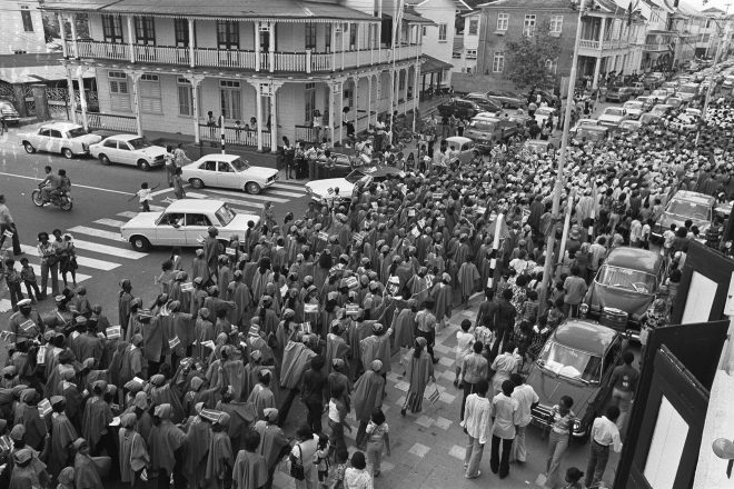 1975年11月25日、スリナムはオランダから独立。写真は、通りに集まる大勢の人々。©GettyImages