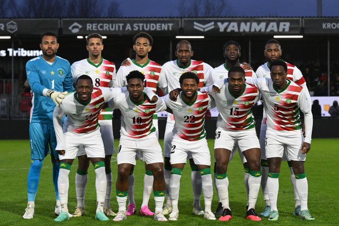 スリナムでは、サッカーに人気がある。写真は、2024年3月にオランダで行なわれた、マルティニーク(カリブ海に位置するフランスの海外県)戦に臨むスリナムのメンバー。©GettyImages