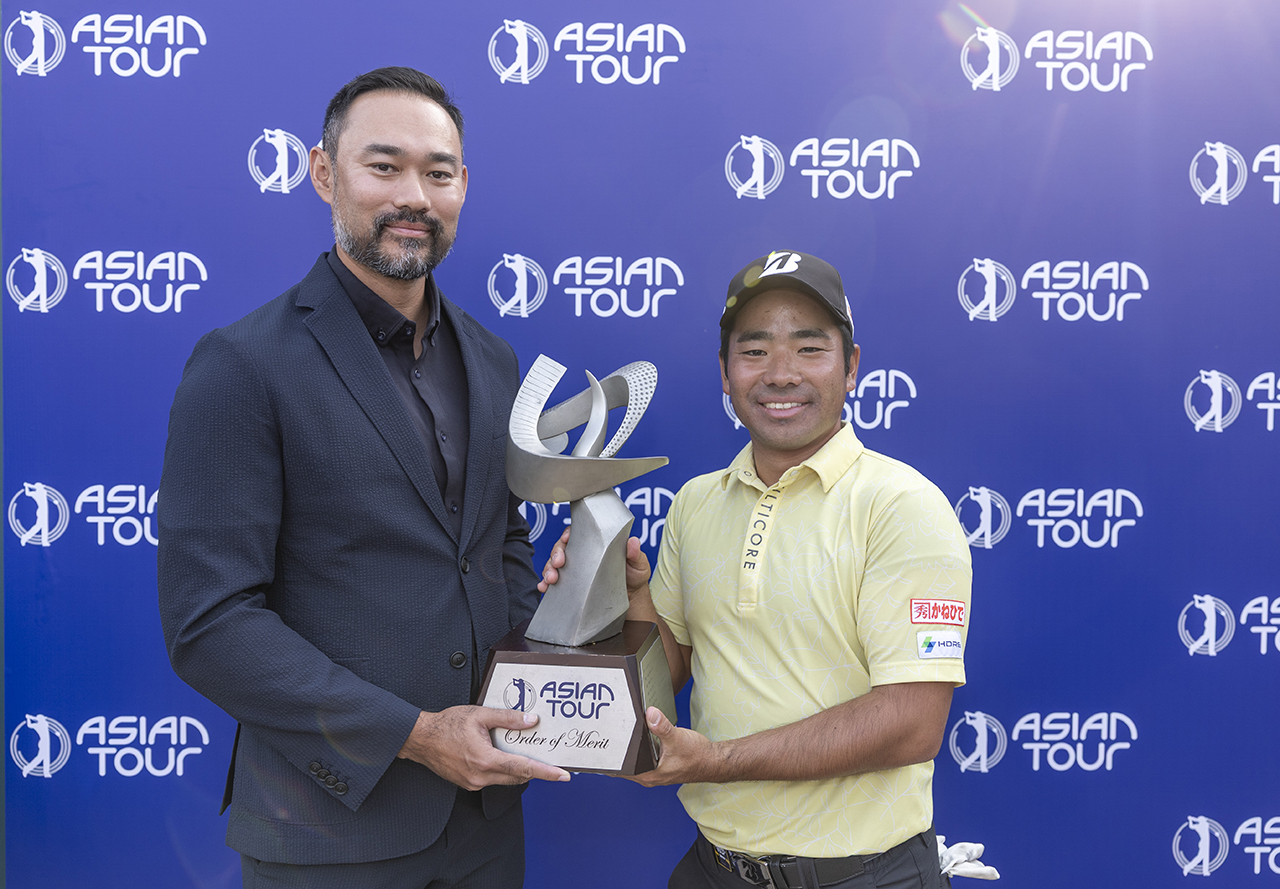 アジアンツアーコミッショナー兼CEOのチョ・ミンタン氏(左)から年間王者のトロフィーが贈られた比嘉一貴。